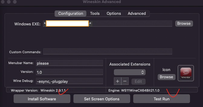 - 완성된 파일은 Applications/Wineskin 폴더 안에 있고, 원하는 곳으로 이동시켜서 Finder에서 더블클릭으로도 실행 가능함~